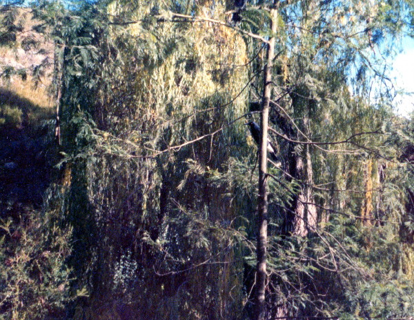 We traveled to a nearby forest preserve of which the biggest attraction is the Den of Nargon, an Aboriginal site of ancient significance. To reach the Den we had to take a foot trail which wound down the side of a narrow semitropical canyon. In some places the trail was slippery and blocked by fallen trees. There were also long vines hanging from the trees by which one could swing, like Tarzan. At the floor of the canyon a well trod path led upstream to the Den. This was the first time Paul or Robin had seen water flowing over the ledge just above the Den.