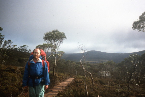 Oct 27, 1989 Paul took me to Port Melbourne for the 6:00 PM ferry to Tasmania. Talked with Christine, Belgium woman I had met in Nimbin. After arriving at Devonport at 8:00, I took a bus to Cradle Mountain with Phalim O'Reilly. Phalim was an Irish actuary working in Melbourne. The first days hike involved a lot of uphill in a wet drizzle. I soon found out that Phalim was very ill-equipped for this hike. I lent him my rain poncho, gaiters, and shared my water bottle. We got to Waterfall Hut the first night.