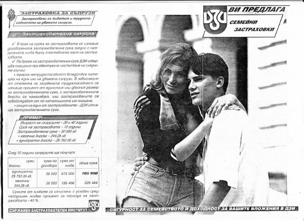 The state insurance company, DZI, I had thought would have very conservative advertising. But that did not seem to be the case. The advertisement to the below right is for "family" insurance. Likely an unconventional family.