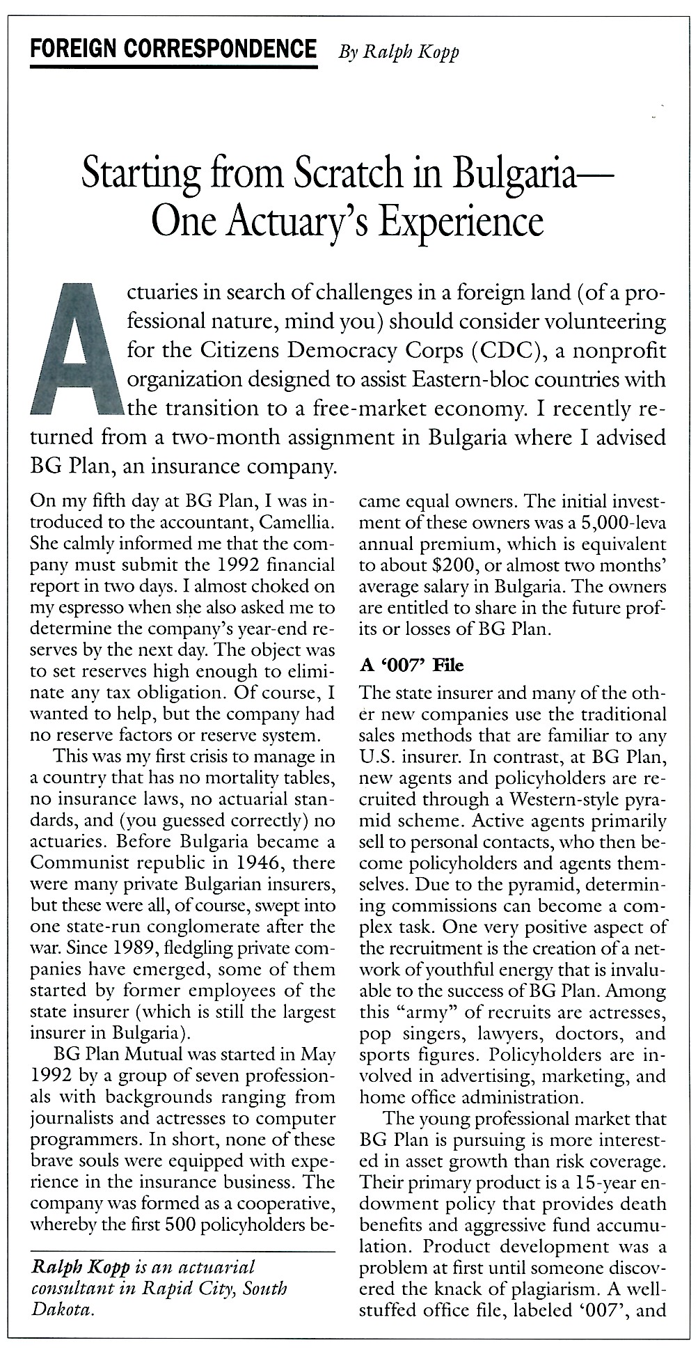 Article In 1994 I wrote an article about my experience, "Starting from Scratch in Bulgaria - One Actuary's Experience", 1994 Contingencies