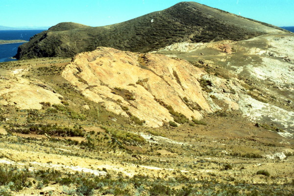 Wednesday, May 28, 1997 We get up early for the boat tour of the Islands of the Sun and Moon. The boat left about 8:30 AM from the port with about 20 passengers. Besides us there were a number of Israelis, French, Suisse, a New Mexican, and other foreigners. The surprisingly comfortable boat was covered, had cushions on the seats, two US boat motors, and plenty of gas. It took two hours to reach the north side of the Island of the Sun.