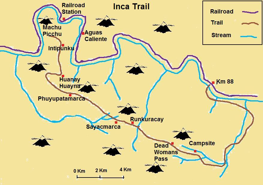 On the way out of Cuzco the last train car had problems, which were resolved after about a 30 minute stop. Bernie played with a little girl, especially using his bubble blowing kit. Food available on the train included bread, coffee, cheese and meat sandwiches, choclo (corn), and other goodies. About 10 AM we reached kilometer 88 and got out to start the trek. After paying the $17 fee, we register and then cross the bridge over the swift Urubamba River. The elevation is 7,200 feet at the start.