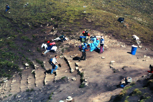 Sunday, June 1, 1997 We were on the trail by 6:30 AM, heading uphill to the Abra de Huarmihuanusca (Dead Womans Pass). I reached the top by 11:00, but we had to wait an hour for the others to reach the 13,500' pass. After resting, Jan decided to go back to the start, and Rick decided to return with her.