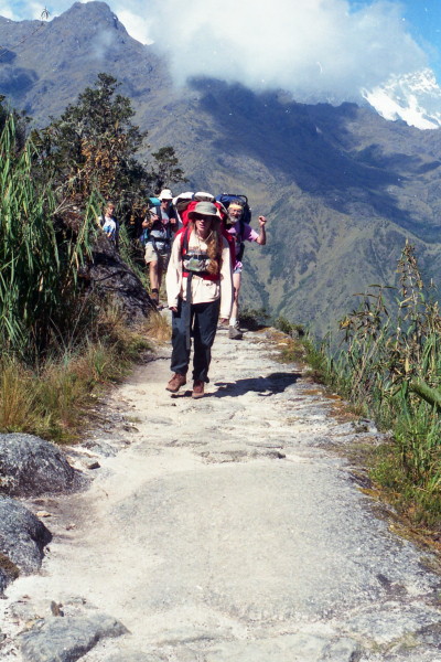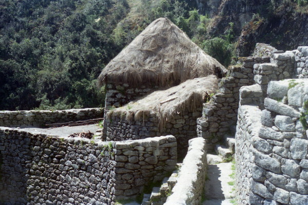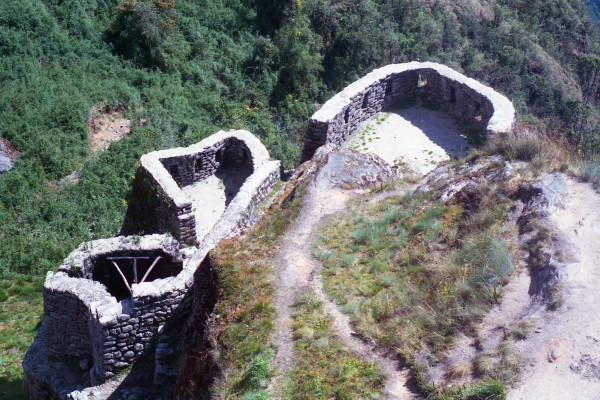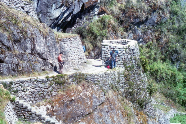 Monday, June 2, 1997 Josh and I went up to the ruins in the morning. The view was spectacular. We left the site about 8:30 AM. The first part of the trail winds upward on the highly visible Inca road. About 11 AM, soon after going though a tunnel 20 yards long, we reach the 3rd pass (13,000'+) of the hike. Directly below are the ruins of Puyupatamarca (Cloud level town). The ruins have a fine set of ritual baths and a large number of agricultural terraces.