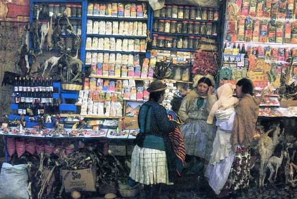 For lunch we have today's special at a cafe. For $2 I get vegetable soup, bread, radish salad, roast chicken plus a potato/carrot salad, and a suspect orange creme for dessert. Next we tour the Witches Market a short distance away. There woman sell llama fetuses, talisman, herbs, and other concoctions.