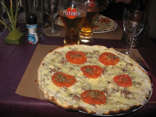 April 6, 2014 I walked some distance on the road to avoid the muddy trail. Bernard had the same idea. We walked mostly together to Condom. At the gite, 4 English were staying in a room. Eric, Bernard and I were in another room. That evening, Bernard and I went out for pizza and beer.