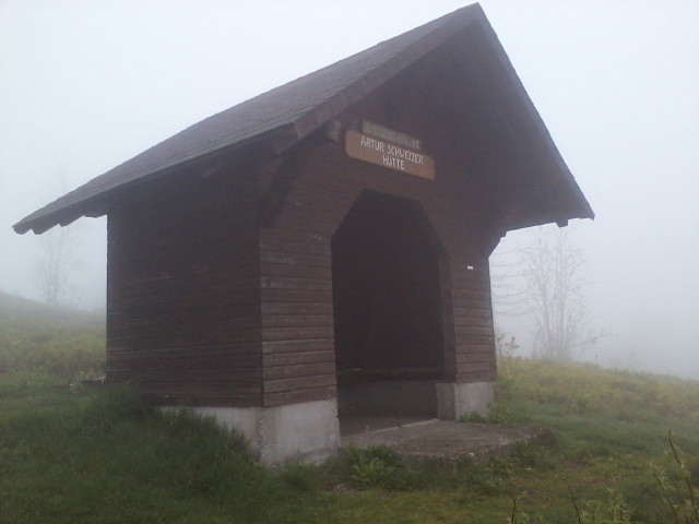 May 14, 2015 It was a chilly, wet, foggy morning. I had a schnitzel lunch at Weibenbachsultei. Eventually I got to Schwellen Hut. Was a steady rain all night.