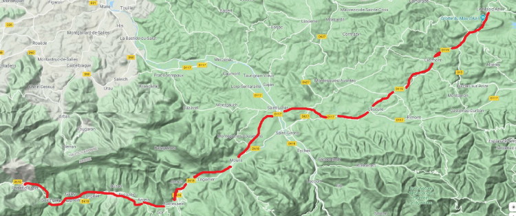 October 31, 2019 I left at 6 AM because I had a walk of 27 kilometers and I wanted to be sure to get to St Lizier tourist office before 5 PM. It rained off and on until 11 AM. Soon out of Mas d'Azil the road D119 went thru a long tunnel, where an old grotto is located. It is a main tourist attraction for the area.