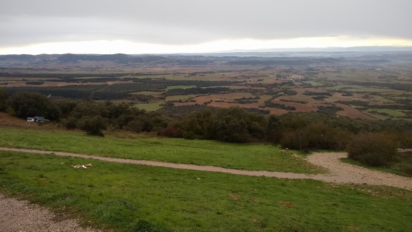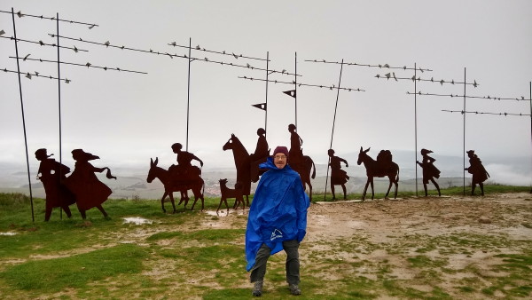 November 16, 2019 It was 30 degrees F to start at 7:45 AM, but not raining. It was a long way to walk out of Pamplona and then past Zizur Mayor. Then it is a climb to the top of Alto del Perdon at 770 meters, and is where the metal figures of pilgrims are set. One of the South Korean women, Yeah Eu, was there. It was snowing a little at the top.