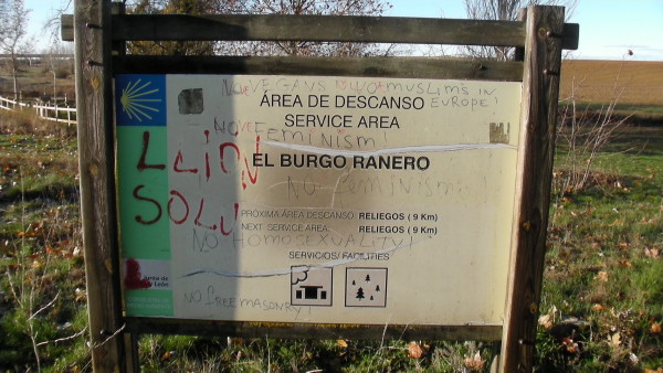 December 2, 2019 After big coffee con leche started walking before 8 PM. Was a blue sky and sun for once. Stopped at Releigos and had coffee with 4 other pilgrims. Walked with them to hostel in Mansilla de las Mules. The hostel almost filled up. The Italian and his dog were there too. Had dinner there as did most everyone.