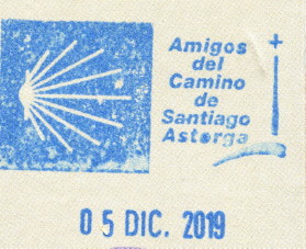 December 5, 2019 The owners had an odd rule that you had to stay in your bed until at least 7:30 AM. After a very large breakfast I headed out at 8:00 on another clear sunny day. I caught up with Steve after about 6 km. We had a coffee later in San Justa de la Vega, then ran into Laura from Switzerland. We stopped at a spot along the road where a Spanish man lives and offers a variety of food and drinks to pilgrims.