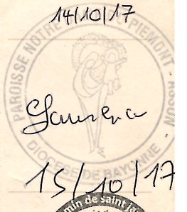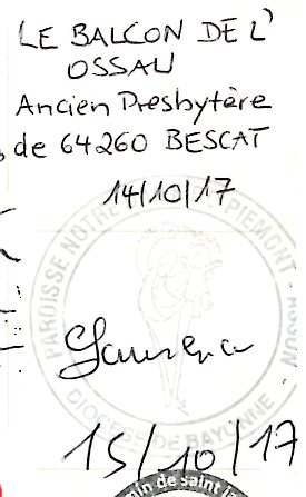 October 15, 2017 Had a great breakfast with my hosts. The country roads were mostly quiet on this Sunday morning. While walking next to farm field I stopped to take a photo. As I got ready to leave I noticed a wallet placed on a fence post next to me. It was for a young French guy, with French id, bank cards, money, etc. I took it with me expecting to turn it in to Lourdes police the next day. About a kilometer later, I stopped at Mifaget, a nearby village, to eat lunch on church steps. Soon a young French pilgrim comes by who speaks good English. I ask him about what to do with wallet. He says it is best to contact the local mayor. We ask a woman in a car about the mayor and she points to a large house next to the church. We knock on the door and the woman mayor opens the door. After discussion the mayor takes the wallet and will initiate contact, though the guy is not a local. She was very nice and offered us food and to sell us cheese. About every farm here seems to have cheese.