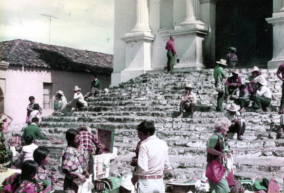 Joe, a Californian, and I took a bus to Chichicastenango for the Thursday market. The road there was very rough and twisting as it wound through the mountains. Several buses and trucks were broken down along the way. Indians come from miles around to the market to sell their products. The "Chichi" market is dominated by the catholic church, the scene of worshipping Indians, and burning incense. The Indian religion seems to be a mixture of traditional Catholicism and ancient Mayan beliefs.