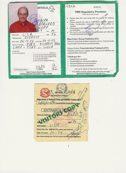 Later that day I was able to secure the TIMS registration card and the Sagamatha (Everest) National Park entrance permit (shown at left). They were easily obtained at the Visitor Information Center. Also nearby was the Ratna Park Bus Station where I was able to purchase a ticket for the bus to Jiri, leaving the next day.