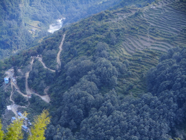 November 1, 2023 We left the hotel at 6:30 AM to get to airport for our 8 AM flight to Pokhara. The flight was less than 30 minutes. Our guide, Ram, and porters Kali and Ewass came to pick us up at 9:30 in a jeep with driver. It was almost a 3 hour drive to Jhinu, the start of the trek. The last hour + was on a rough mountain road.