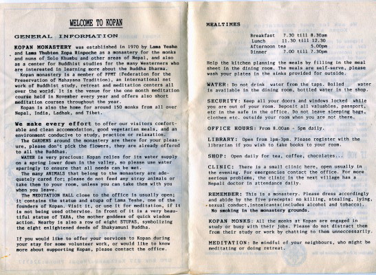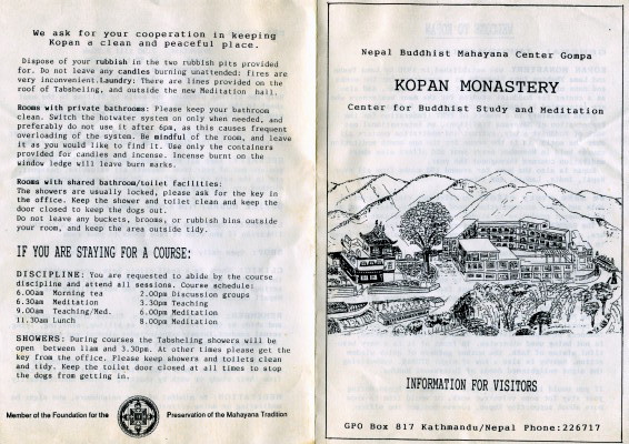 Oct 18-26, 1993 At Kopan Monastery I shared a room with Morey from LA. Nita had Heidgren, a woman from Germany. Each day was mostly the same. See the meal and "discipline" schedules to get an idea of how full the day was.