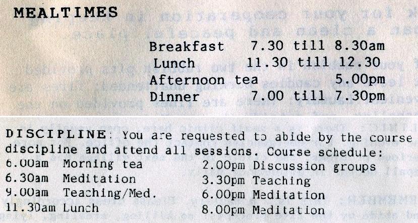 All the meals were vegetarian. Our teachers were a 68 year old Lama from Tibet, Karen a nun from Sweden, and Rivena a nun from Australia. There were about 40 westerners. After 6 days people began to get stir crazy and mentally fatigued. A few left from either sickness or from a severe deficiency of beer and apple pie.