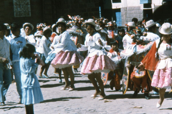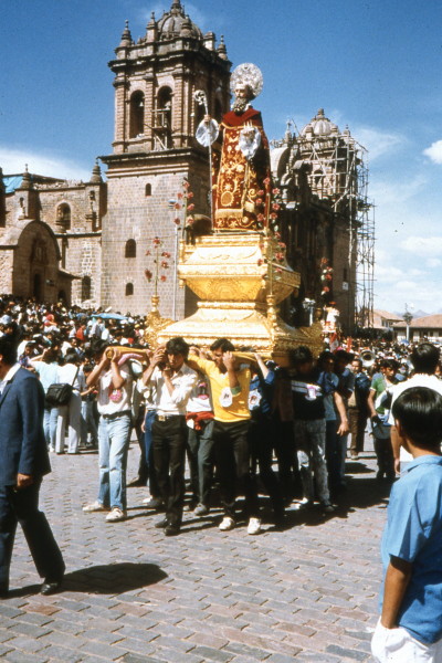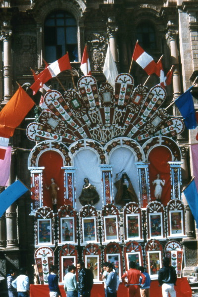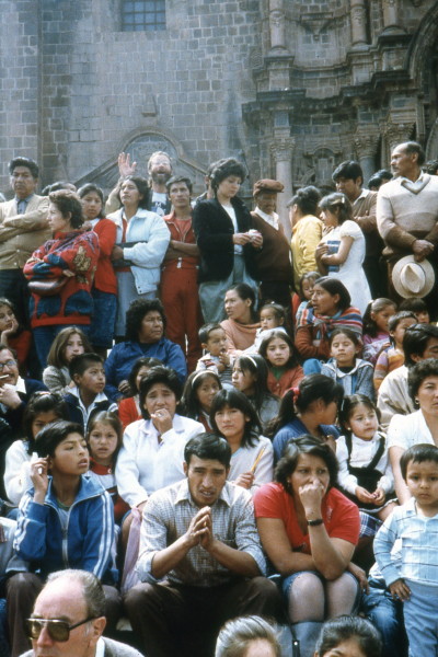 Thursday, June 2, 1988 Today is Corpus Christi day, a big festival day for Cuzco. At the 'postcard' cafe near our hotel, I had cheese and egg omelet plus pineapple juice for breakfast. The religious ceremonies were very slow and the crowds filled the Plaza de Armas. We did not stay for the whole thing. That night we had a dinner at a Japanese restaurant and later, at a rundown theatre, we saw the US movie, The Hitcher, for 42 Intis.