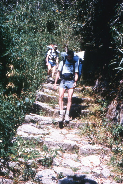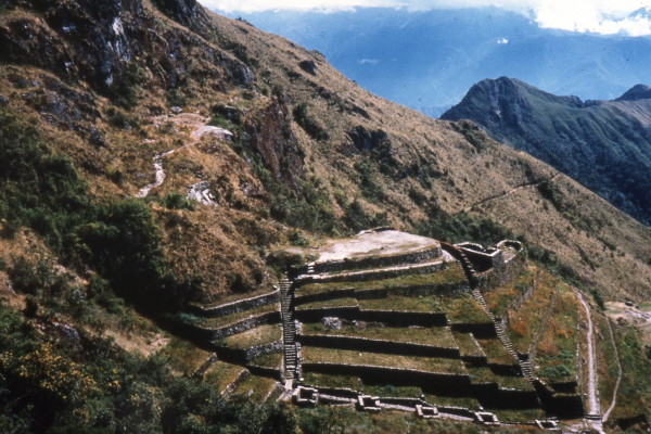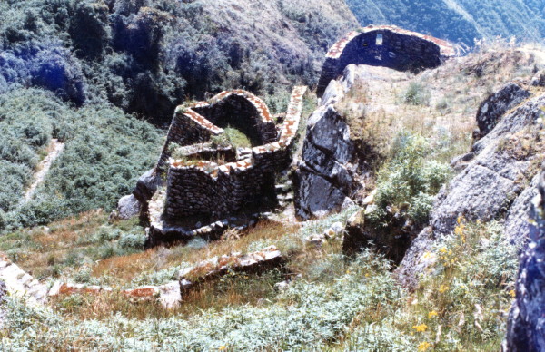 Wednesday, June 8, 1988 In the morning we had breakfast and waited for the sun to hit our tent. We left early morning and hiked to the third pass which overlooked the ruins of Puyupata-marca. We ate lunch at the ruins. Trying to find the Inca Trail at the bottom of the ruins, I fell headfirst off one of the terraces with my pack on.