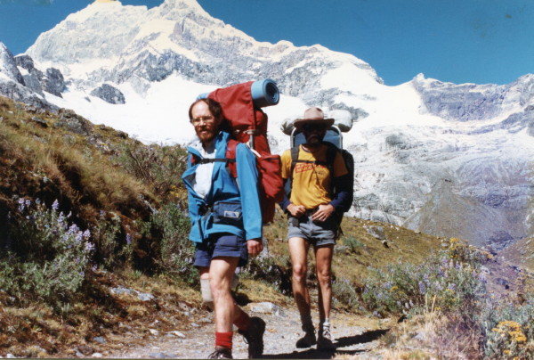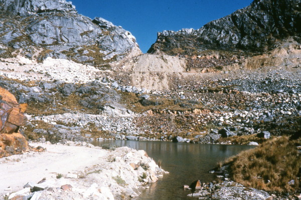 Wednesday, June 15, 1988 Our campsite offered some good early morning sunlight. Rick gave some bread to a guide who passed by with some mules. The trail led down the valley, following a stream, in the afternoon, we reached the village of Colcabamba, where we bought cokes and sugar (for cocoa) from Mrs. Calonge. She had lost her husband the previous year. We hiked up the next valley and camped in a boggy meadow next to a swift stream.