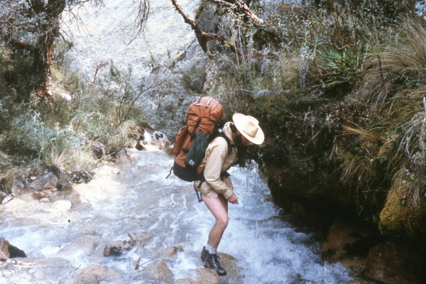 Sunday, June 19, 1988 We had breakfast of the last of our food, except for a few figs and nuts. The trail down was fairly steep in places. We came upon a group of burros coming toward us, so we waited for them to pass on the narrow trail. One burro fell to its knees and then slid down the steep shale slope toward the river below. We helped two guides get the burro back on its feet and up to the trail, one guide lifted and carried, in his bare feet, each of the two heavy boxes back to the trail. There they loaded the boxes again on the burro's back.