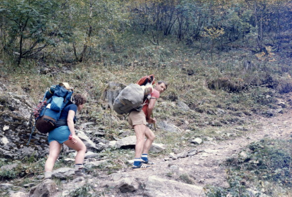 At 2:00 PM Lonya, the 3 Seattle women, and I ate an early lunch before departing. We took a bus about 3 miles to the head of the trail. Lonya siphoned gas from the bus into his fuel bottle. We asked him what he would do after 2 days when he ran out of fuel. He said that in Svanetia there were cars and trucks from which gas could be siphoned. I told him we would be arrested in the USA if we were caught siphoning gas.