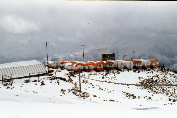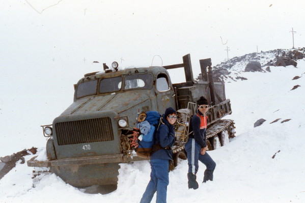 Sep 14, 1985 During the night, the storm had worsened. It was advised that everyone go down the mountain. All 20+ people packed up and hiked down the mountain to the trams. Visibility was poor and the snow was over a foot deep. Some of the Russian guides wore only tennis shoes on their feet. Most of the participants were very disappointed in the weather.
