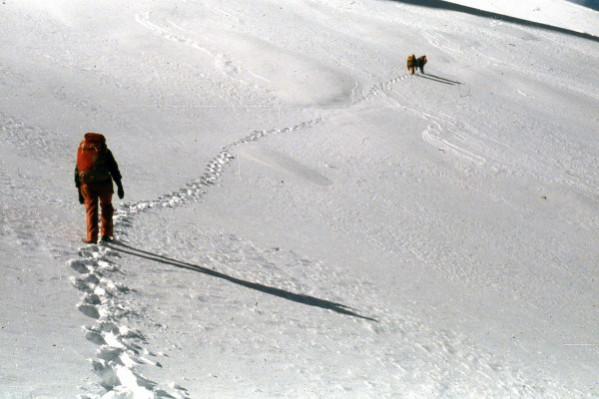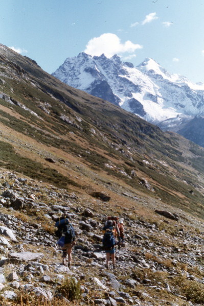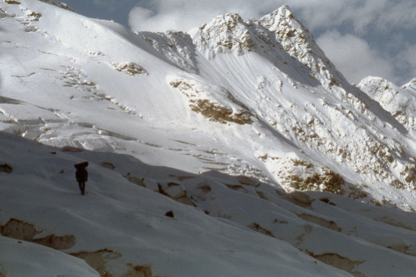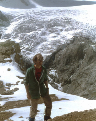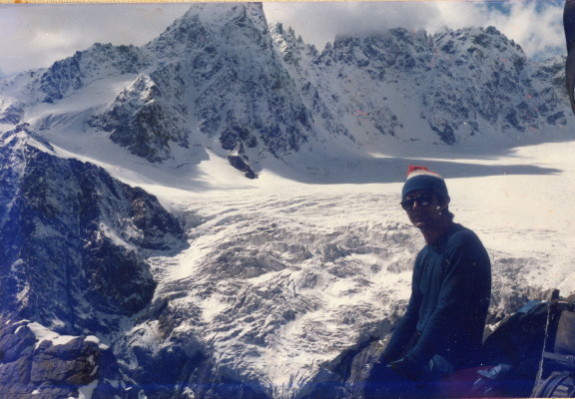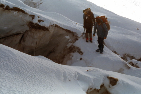 Taya fell into a small ice crevasse, but emerged unharmed. Snow covered many of the ice crevasses, so it was important to be very careful. A few times we held onto a rope as we crossed over a crevasse. The last few hundred feet to the top of the pass was very steep. I could hear my injured right knee crack with every step. In early summer I had badly torn my ACL in a soccer game.