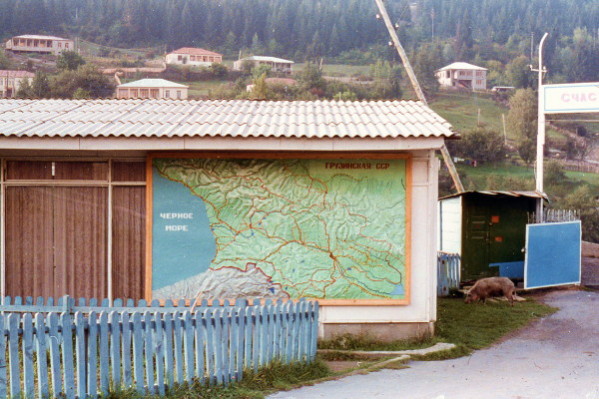 That night we could not find a restaurant open, so we had to settle for one more backpack meal. It seemed very unusual that almost everything would be closed up at night. Taya blamed it on the new liquor laws. In Mestia as in the other Svantin villages, cows and pigs freely wandered the streets. One had to watch his step.