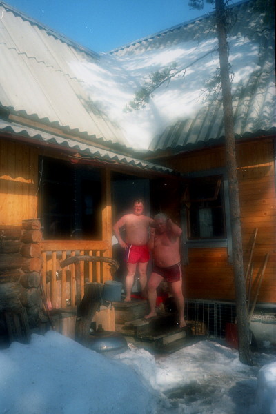 Periodically we took a break to drink tea or beer. To make the sauna hotter Uncle Konstantin would throw water, mixed with eucalyptus oil, on the stove. At times I would have to breath deeply to get enough air. After a while we jumped in the snow to cool off. Then back In the sauna. Afterwards, we had a dinner of fried chicken, raw bacon, fish, salad and soup, with many toasts of vodka.