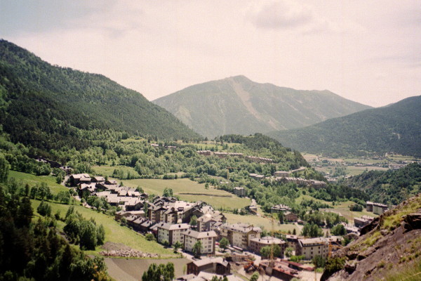 June 11, 2001 I took an afternoon bus to Andorra. The mostly empty bus arrived at 8 PM. I soon found a hotel room with bath for only $13. Andorra, known mostly for tax free electronics, perfume, chocolates, etc, was a pleasant town in the midst of the Pyrenees and situated between Spain and France.