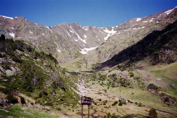 June 13, 2001 I walked downhill to the ski village of Arinsal. From there the trail led steadily up to the pass at Port de Belau at 9000 feet altitude. Along the way I saw several helicopters delivering supplies to a nearby refugio. The snow at the pass was soft and deep. Luckily none of it was very steep. Though the first few hundred yards down from the pass looked impossibly steep at first, it turned out not to be difficult. I lost the path a few times and eventually reached Pla de Boet, which had campsites.