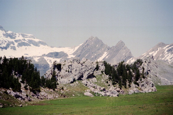 June 23, 2001 I bought a few groceries at a small grocery store in Parzan, then headed up to the Collada de Pietramula. The views of the Valle de Ordesa were excellent. At the Refugio de Pineta I asked about the steep trail that I planned on climbing tomorrow. They warned me that many large trees were down and that snow near the top required an ice ax and crampons. Since I had neither an ax or crampons, I decided to end my walk there. That night I enjoyed a communal meal at the refugio.