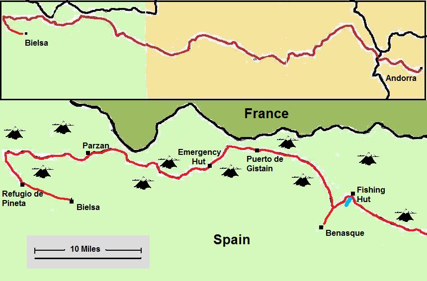 June 24, 2001 From refugio, I walked about 6 miles to Bielsa, the nearest town. I found a room there. The tourist office told me how I could get to Zaragoza the next day, Monday. Bielsa was very close to the French border and seemed to be a very popular town for French shoppers. Popular goods were port wines, liquors, cheeses, and hams.
