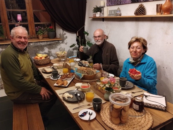 April 19, 2024 We had breakfast at a nearby bar, then hit the road. We followed the river much of the way. The last few kilometers seemed long to me. We got to A Rua and checked into the municipal albergue. Later Lars and Lens showed up and I shared a room with them. Tizianna shared a room with a bunch of snoring Spanish men. Had a communal meal for dinner.