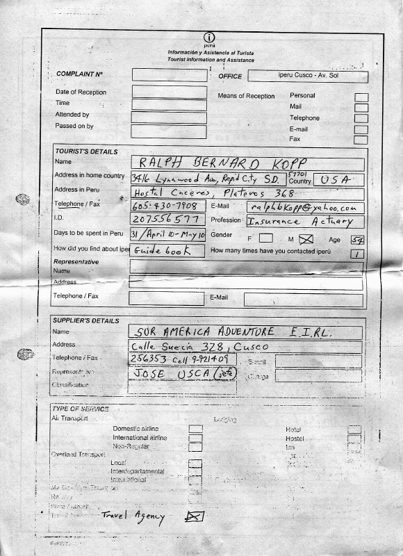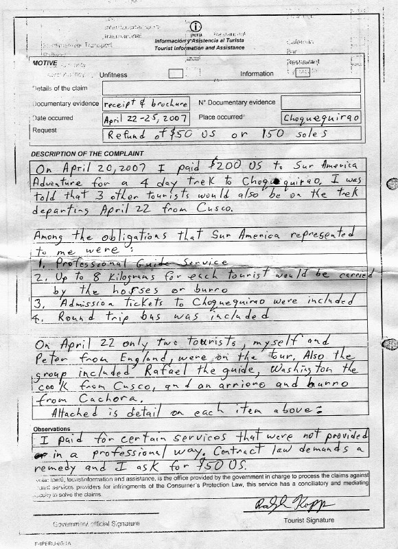 I was very upset about all the problems with the trek, which were the fault of the travel agency. I talked to them about a partial refund, but they were unwilling to consider it. I filed a complaint with the local tourist office, which got their attention. I never did hear how the complaint was resolved, and I did not receive any refund. But I am glad I filed the 10 page complaint below.