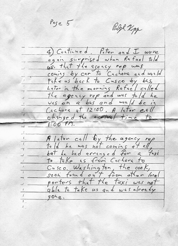If I had it to do over again, I would have backpacked there myself, without guides, cooks, burros, and especially Cuzco travel agencies. I read in one of the Cuzco papers of a local agency that had left a group of tourists isolated in a remote location. Similar to our experience, the agency failed to provide the transportation back to Cuzco.