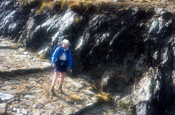 In the morning I hiked up to the pass, near 15,000 . There and beyond were many fine examples of stone Inca Trail. Many stretches were hundreds of meters long. Past the village of Tequesi, the vegetation became much more lush and green. For the last 3 hours I hiked along a high ridge, and camped almost on the trail, next to a loud river.