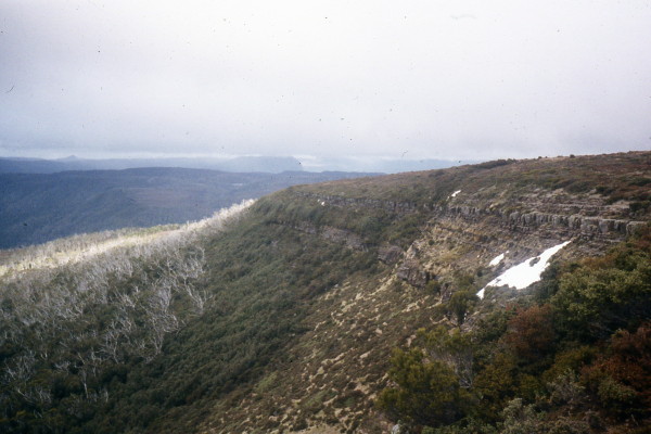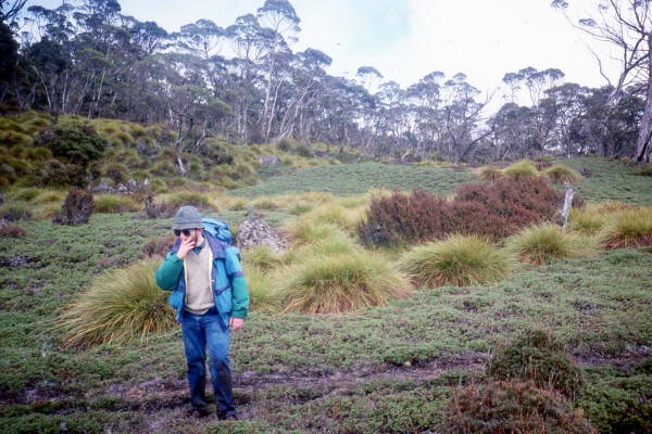 Oct 27, 1989 Paul took me to Port Melbourne for the 6:00 PM ferry to Tasmania. Talked with Christine, Belgium woman I had met in Nimbin. After arriving at Devonport at 8:00, I took a bus to Cradle Mountain with Phalim O'Reilly. Phalim was an Irish actuary working in Melbourne. The first days hike involved a lot of uphill in a wet drizzle. I soon found out that Phalim was very ill-equipped for this hike. I lent him my rain poncho, gaiters, and shared my water bottle. We got to Waterfall Hut the first night.