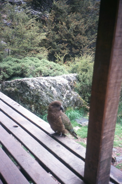 The first day I hiked to the Routeburn Falls Hut. There I saw a kea steal a bar of soap from the hut warden. The hut warden lived at the hut to collect fees and work on the trail.