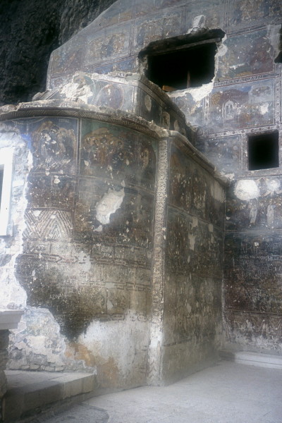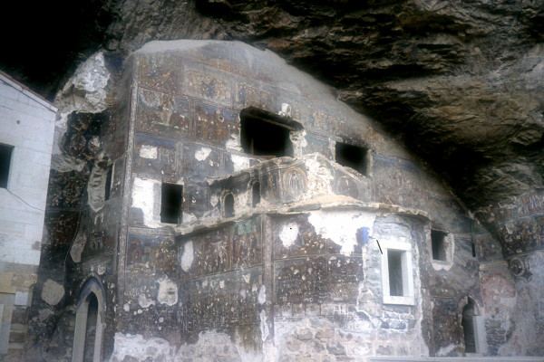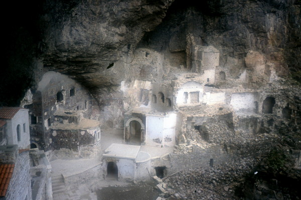 I wanted to go to the Sumela Monastery and soon found the taxi stand where transportation can be arranged. About the same time a South African couple, Wayne and Ronel, showed up with the same idea. The taxi driver took us to the site and waited until we were done touring, a couple of hours later. The Monastery was a Greek monastery, perched on a ledge hundreds of feet above the forest floor below. Much remained from the 6th century buildings.