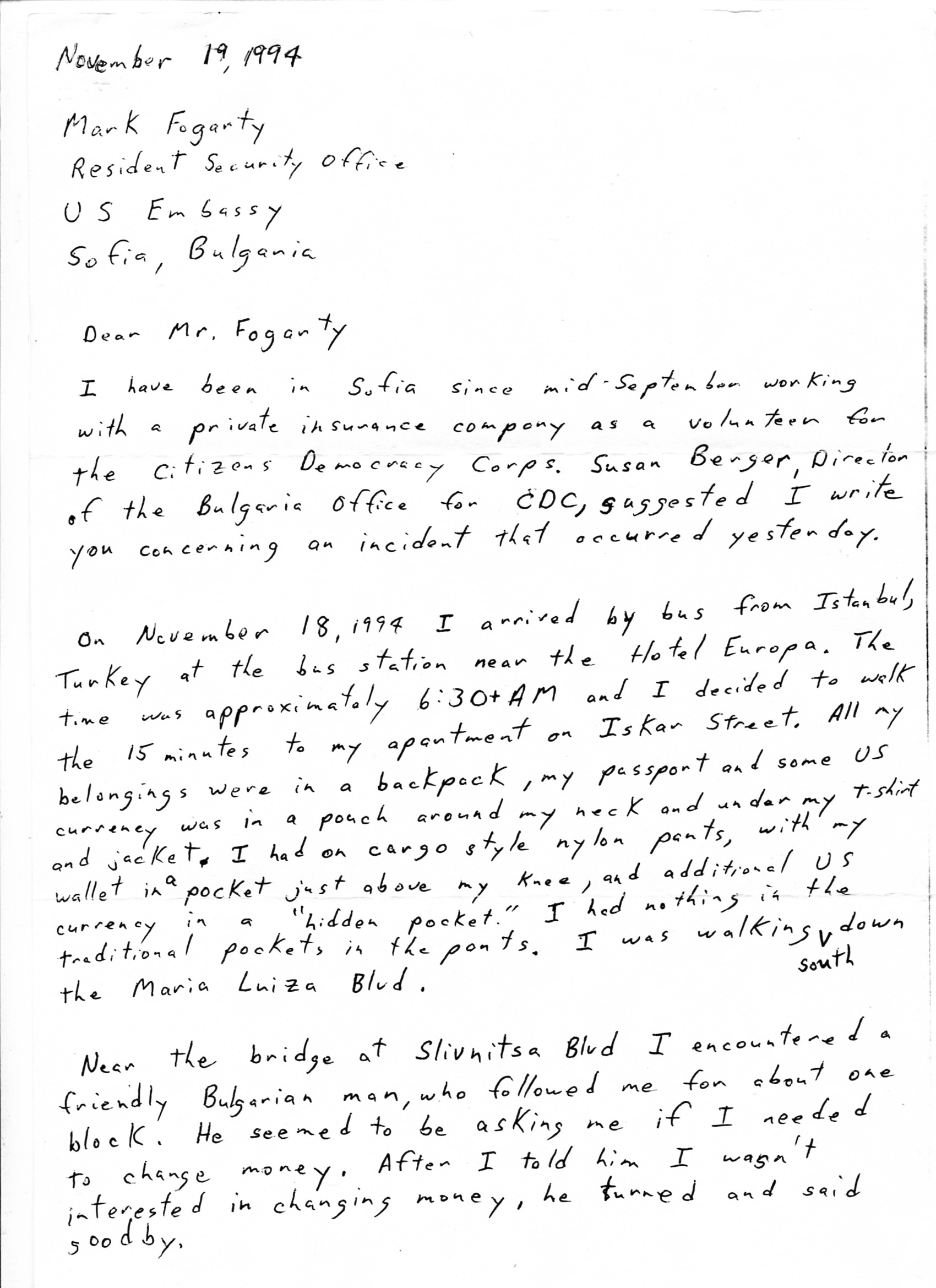 About 6:30 AM we rolled into Sofia. I woke up and recognized the statutes of Cyril and Methodius outside the library. It was not yet light when the bus pulled into the station. I had considered taking a taxi to the apartment, but others on the bus were walking and I knew the way, only a short walk. After a few blocks I was attacked (see location 6 on map) and almost robbed. See letter to US Embassy below