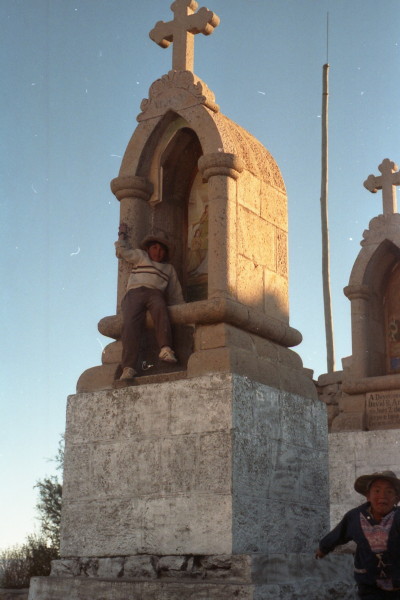 Once out of La Paz the road is mostly level. Many sections of the road are under construction or repair. The detours are very dusty and the towns infrequent. The altitude of 12,000 feet and the lack of sleep over the last two nights causes my head to ache. At San Pedro the bus is transported across Lake Titicaca on a wooden barge. The passengers have to take a separate boat ride.