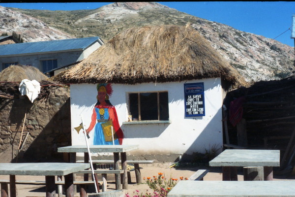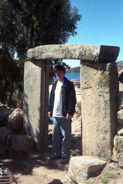 There we saw a museum and then walked to the Sacred Rock. Along the way Rick was attacked by a cow, and had his trousers torn in the fracas. On the way back to the boat, an overpowering urge caused Bernie to take a dip in the waters of Lake Titicaca.