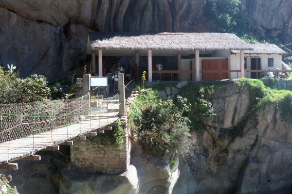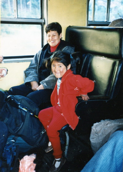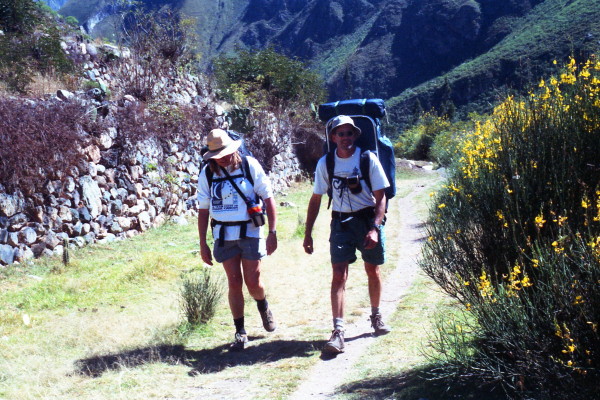 On the way out of Cuzco the last train car had problems, which were resolved after about a 30 minute stop. Bernie played with a little girl, especially using his bubble blowing kit. Food available on the train included bread, coffee, cheese and meat sandwiches, choclo (corn), and other goodies. About 10 AM we reached kilometer 88 and got out to start the trek. After paying the $17 fee, we register and then cross the bridge over the swift Urubamba River. The elevation is 7,200 feet at the start.