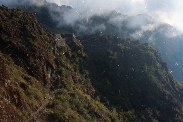 The Inca ruins of Sayacmarca are reached by climbing & very steep, narrow stairs. The settlement was fairly complex, and remote. We had camped here 5 years ago, but "no camping" signs were now prominently displayed.