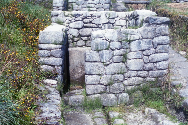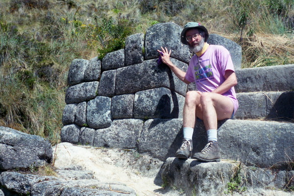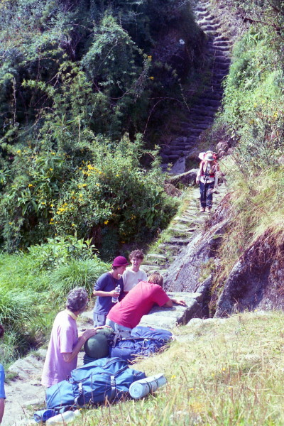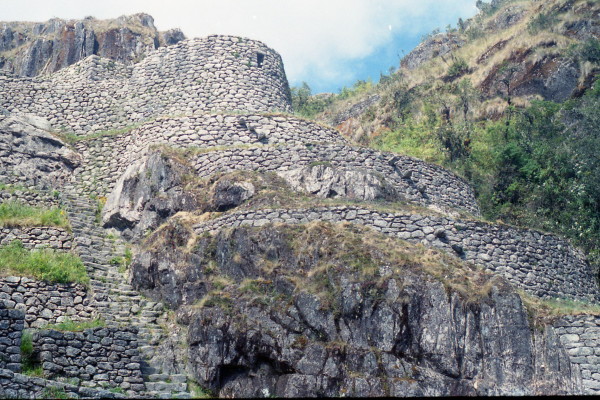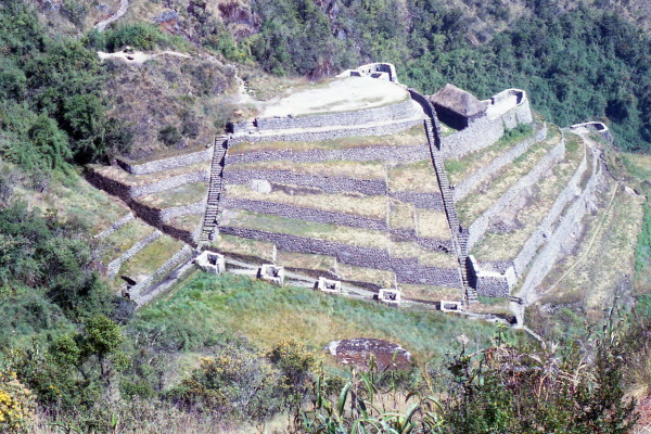 Monday, June 2, 1997 Josh and I went up to the ruins in the morning. The view was spectacular. We left the site about 8:30 AM. The first part of the trail winds upward on the highly visible Inca road. About 11 AM, soon after going though a tunnel 20 yards long, we reach the 3rd pass (13,000'+) of the hike. Directly below are the ruins of Puyupatamarca (Cloud level town). The ruins have a fine set of ritual baths and a large number of agricultural terraces.