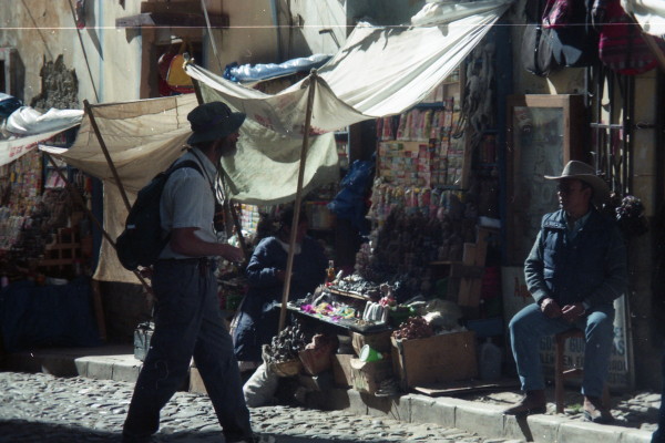 For lunch we have today's special at a cafe. For $2 I get vegetable soup, bread, radish salad, roast chicken plus a potato/carrot salad, and a suspect orange creme for dessert. Next we tour the Witches Market a short distance away. There woman sell llama fetuses, talisman, herbs, and other concoctions.