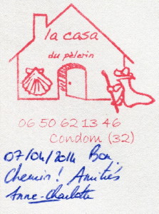 In many gites there is a diary for people to write comments if they want. Most people talk about how great the stay is, but one Catalone (from northern Spain, Barcelona) writes of revolution and separation from Spain. Still wanting to fight the 1930's Spanish Franco war I suppose. In Condom, the gite manager, Anna, was vigilant in being sure everyone wrote something and would not let me leave until I did so.