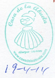 April 19, 2014 Walked to Los Arcos. At Irache saw the wine fountain. Stayed at Casa del la Abuela and shared room with two older women and young Spanish men. That evening visited with Eric and Alan in the square. Skyped with Mary/Bernie.